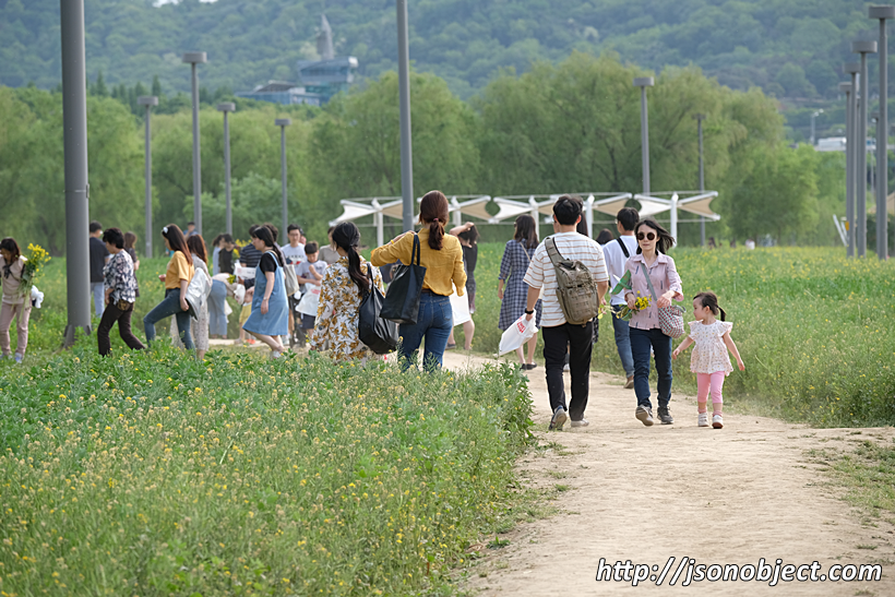 - 서래섬은 매년 5월마다 유채꽃이 아름답게 피기로 유명하다. 최근 한창 만개할 무렵인 2019-05-11부터 2일간 유채꽃 축제를 개최하기도 했다. 이제 한창을 지나 막 지기 시작한 즈음 서래섬을 방문해봤다. 역시나 많은 인파가 유채꽃 풍경을 추억에 담기 바빴는데, 출사로 유명한 선유도보다 더 많은 DSLR 카메라를 구경할 수 있었다. (대중교통으로 서래섬에 가는 방법은 9호선 신반포역 1번 출구로 나와 우회전 후 그대로 직진하여 아크로리버파크아파트를 관통하면 터널을 통해 쉽게 진입할 수 있다.)