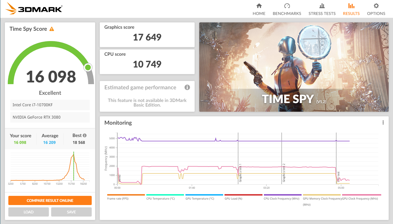 - 아래는 논오버 상태에서의 3DMark의 Time Spy 벤치마크 결과이다.