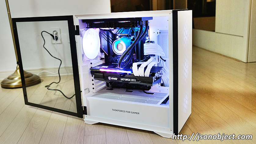darkFlash DLX21 RGB MESH 강화유리케이스의 만듬새가 보면 볼수록 훌륭하다는 생각이 든다. 유행을 타지 않는 무난하고 심플한 디자인에 마감이나 확장성도 훌륭하다. 왜 다들 미들 케이스의 최강자라고 부르는지 알 것 같다. 고민 끝에 화이트 색상을 골랐는데 탁월한 선택이었다. 케이스가 한 덩치 하는데도 불구하고 흰색 벽지로 된 방이 넓어보이는 효과를 준다. 옵션으로 추가한 같은 색상의맥스엘리트 PRISM COMBO 슬리빙 케이블과도 잘 어울린다.