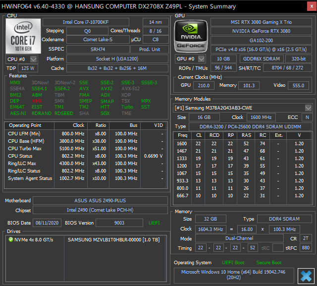 - 개발자 직업을 가진 사람으로서 게이밍 데스크탑 구매의 장점은 스펙이 좋을수록 업무 환경도 좋아진다는데 있다. 8 코어 16 쓰레드의 i7-10700KF로 게이밍 뿐만 아니라 IDE 환경 또한 상당히 쾌적해졌다. 본 CPU는 오버클럭이 가능(K)하고 내장 그래픽이 제외(F)된 모델로 AMD의 버미어 제품군이 출시되기 전까지는 가성비 최강의 게이밍 데스크탑 표준 CPU로 군림했었다. 5.0GHz 국민 오버를 적용하면 게이밍 성능을 높일 수 있다.